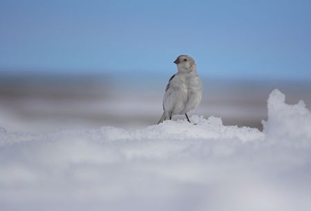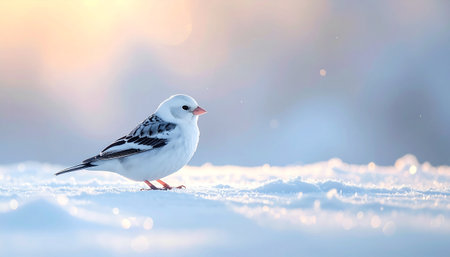 Snow bunting bird standing on frozen ground, soft morning light, wide shot.