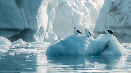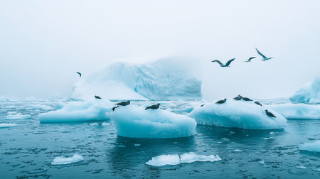 Icebergs in Antarctica with birds. Global warming concept. Toned.