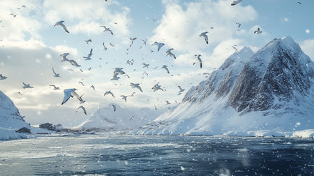 Birds fly gracefully over a serene lake while snow blankets the rocky shore and mountains in winter.