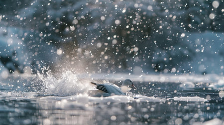 Snowflakes gently fall onto the surface of the water creating a picturesque winter scene as the brave soul takes their ice bath