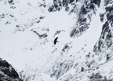Steller's sea eagle in flight with prey on a background of the frozen sea. Japan. Hakkaydo. Shiretoko Peninsula. Shiretoko National Park. An excellent illustration.