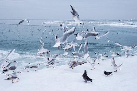 Many flying gulls on the city promenade on the shore of the frozen sea in winter afternoon