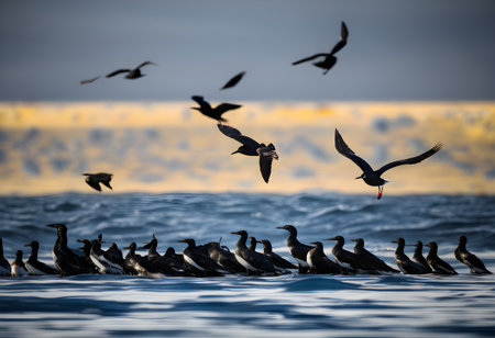 A group of seabirds with oiled feathers, struggling amidst slicks of black pollution caused by offshore drilling.
