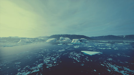 Icebergs in Antarctica with birds. Global warming concept. Toned.