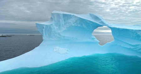 Huge blue towering iceberg with melted hole inside drifts polar ocean. Big glacier ice cave glacial formation calving icy water waves. Ecology, melting ice, climate change, global warming. Static shot