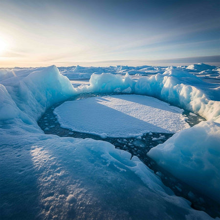 A vast, snow-covered Arctic landscape with unique ice formations and a clear blue sky, evoking a sense of serenity and natural beauty in a remote, frozen environment.