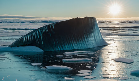 A large iceberg stands proudly in calm waters, reflecting shimmering light as the sun sets on the horizon. The serene landscape is dotted with smaller ice pieces, showcasing nature's beauty.