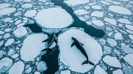 Two dolphins swimming on ice floe, Antarctic Peninsula, Antarctica.