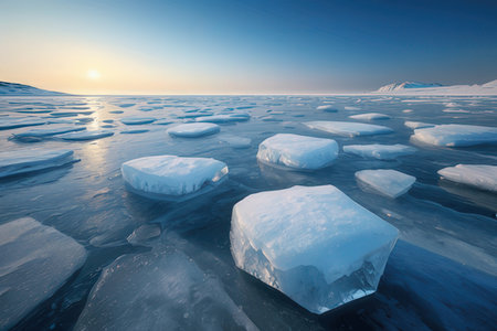 A tranquil scene unfolds with large icebergs drifting in calm waters. The sky is cloudy, while the sun casts a soft light, reflecting on the icy formations in this remote location.