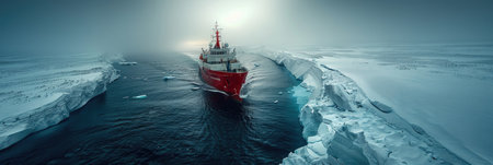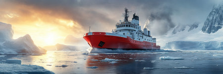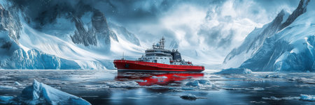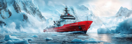 The red icebreaker ship powers through icy waters, surrounded by majestic glaciers reflecting the soft light of a polar sky. Generative AI