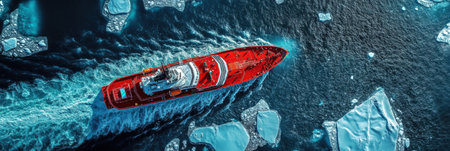 A red icebreaker ship cuts through icy polar waters, surrounded by majestic glaciers under clear, crisp skies in a remote landscape. Generative AI