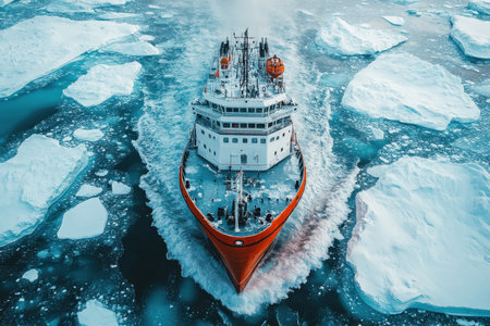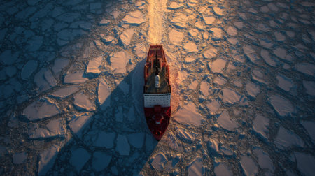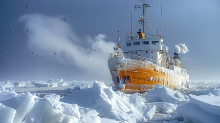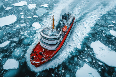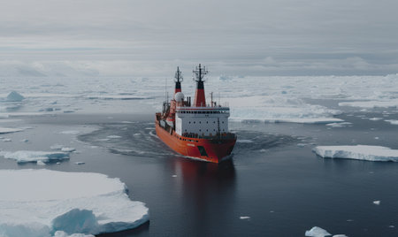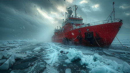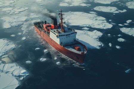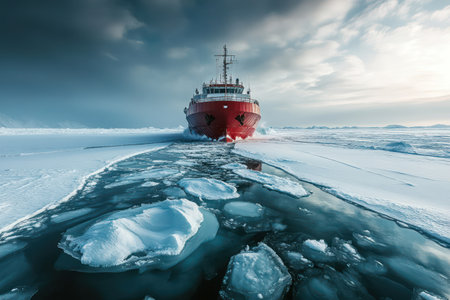 Heavy-duty icebreaker navigating frozen ocean, breaking thick ice, symbolizing strength, exploration, and arctic expedition.