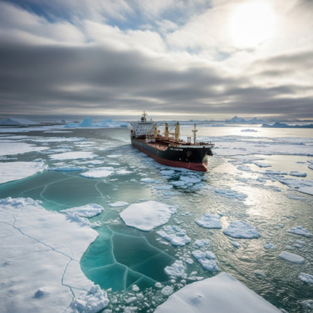 An icebreaker ship carves a determined path through the frozen expanse of the Arctic Ocean.