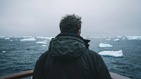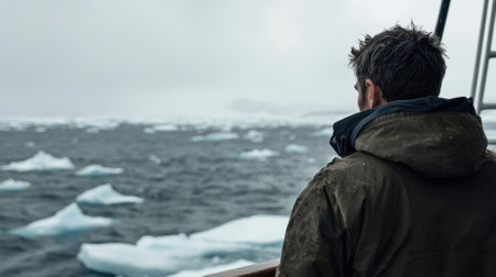 A man stands on a ship, gazing out over icy waters filled with floating icebergs. The atmosphere is cold and gray, indicative of a wintry environment.