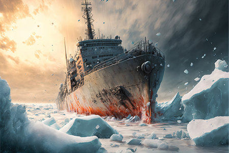 Ship breaking through the ice in a frozen sea illustration. Deep naval seascape art of an arctic ice breaker battleship with old decaying paint in an epic sunset illustration. generative ai