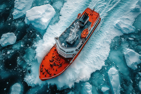 From a breathtaking top-down perspective, a powerful red icebreaker ship carves a determined path through the vast, frozen expanse of the polar sea.