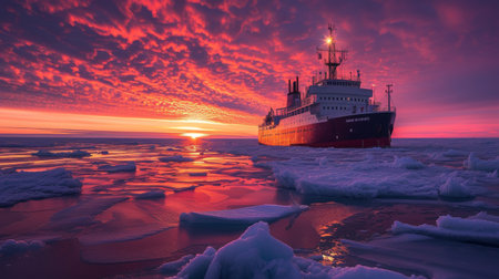 A large ship navigates icy waters under a vibrant sunset, reflecting warm hues on scattered ice floes