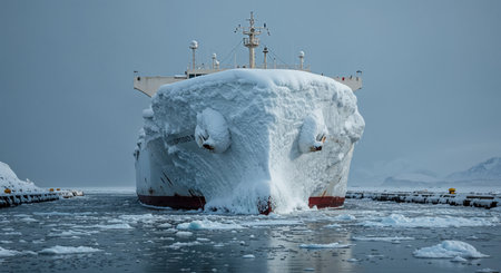 The bow of a massive vessel, completely covered in a deep layer of snow and ice, moves slowly through icy waters with floating chunks of ice and a snowy dock.