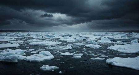 Expansive view of a frigid sea filled with floating white ice chunks and icebergs, illuminated by dim light under an overcast, dark, and powerful cloud formation.