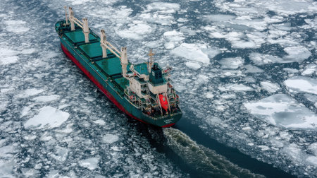 An aerial view captures a cargo ship navigating through ice floes in a cold ocean, illustrating maritime activity in challenging Arctic conditions. Perfect for industry and nature themes.
