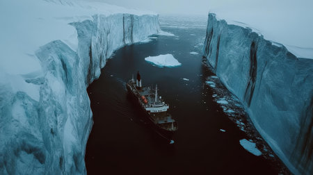 A powerful icebreaker ship cuts through icy polar waters, navigating among towering glaciers under a dramatic sky filled with clouds. Generative AI