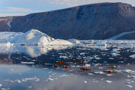 Boat full of tourists explore huge icebergs drifting in the bay near Ilulissat greenland arctic, Antarctic peninsula