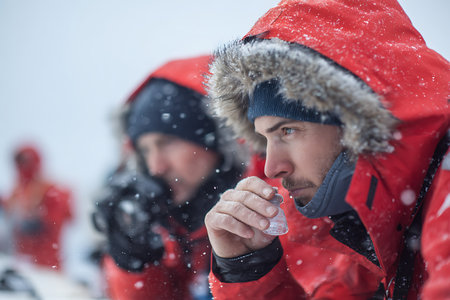 Weddell Sea, Antarctica – September 8, 2013: Scientist waiting for the landing of a helicopter during evacuation of a polar research camp over an ice floe due to cracking of the ice by storm swells.