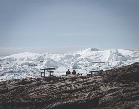 Two people sitting with view towards Icefjord in Ilulissat. Easy hiking route to the famous Kangia glacier in Greenland. The Ilulissat Icefjord seen from the viewpoint.