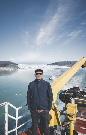 A young man traveler tourist standing in front of Eqip Sermia glacier called Eqi Glacier. Wall of ice in background. The concept of global warming and professional guides. On a sunny day with blue sky.