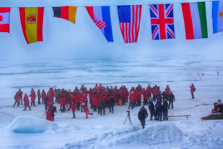 North pole - 2 July 2016: Mission is over: flags of all participating countries tremble at the North pole. Back guards against polar bears