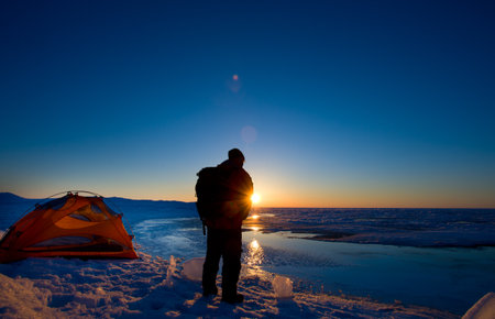 Man traveler on the ice field of Baikal lake. Winter landscape of Baikal lake with blue ice floes, Siberia, Russia