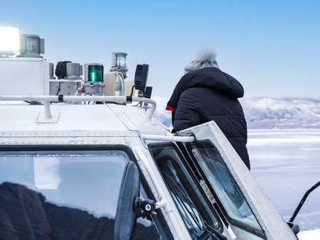 SIBERIA, RUSSIA - Feb 18: A group of tourists at lake Baikal in a trip on the most popular transport - hovercraft in February, 18, 2012 at Siberia, Russia.
