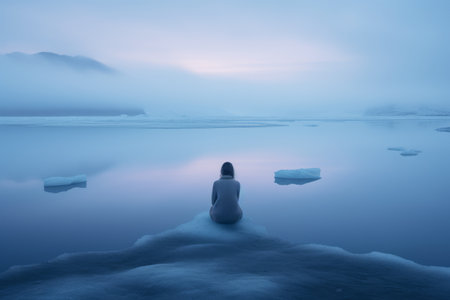 A lone figure gazes at the breathtaking sunrise over a frozen expanse, enveloped in a misty atmosphere. The early morning light creates a serene ambiance.
