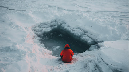 Sitting quietly near an ice hole, a person embraces the falling snow and the serene beauty of winter nature.