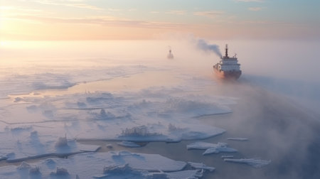 Ship cruising among sea ice. Arctic expedition icebreaker boat on frozen ocean water. Generate ai