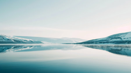 This tranquil arctic scene showcases a vast blue expanse with soft pastel hues. Snow-covered mountains reflect gently in the calm waters, creating a peaceful ambiance in a remote location.
