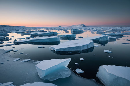 icebergs floating in chilly polar water, early morning, created with generative ai