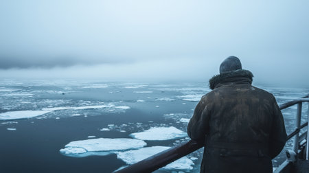 A person stands on the deck of a ship, gazing at floating icebergs in a vast, foggy sea. The moody atmosphere emphasizes the isolation of this chilly landscape.