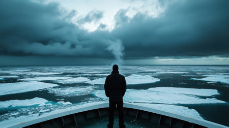 A person gazes out over a sprawling icy ocean from the front of a ship as dark clouds loom above, creating an atmosphere of anticipation and wonder during an expedition.