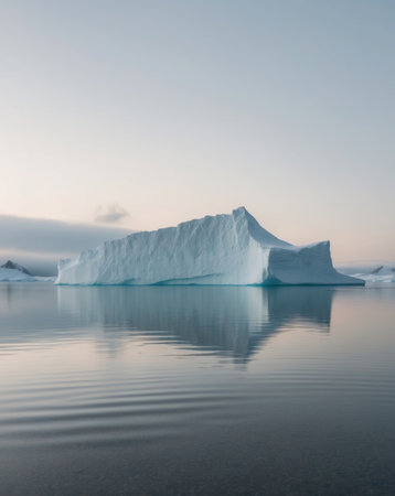 A stunning iceberg emerges from the calm waters, reflecting the soft hues of dawn.
