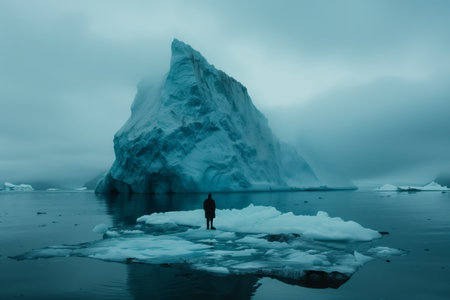 A person stands on a piece of ice in front of a large iceberg. The scene is desolate and cold, with the person alone in the vast expanse of ice
