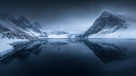A breathtaking winter landscape featuring majestic mountains reflected in a calm, icy lake. The serene atmosphere captures the beauty of nature in solitude.
