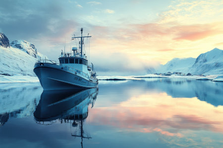 A boat rests in a serene fjord surrounded by snowy mountains as the sun rises, creating a picturesque view.