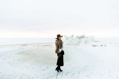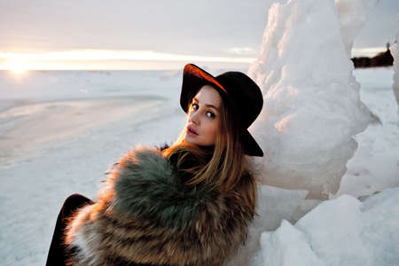 Elegant girl in fur coat and hat at sunset against frozen sea