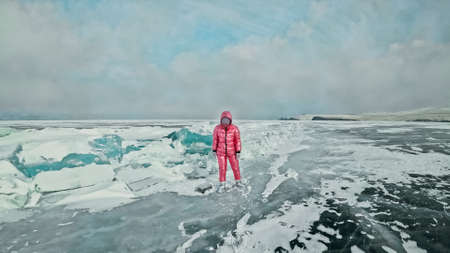 Girl walking on cracked ice of frozen lake Baikal. Woman traveler explores and looks at an ice floe. Magic purest place in nature. Ice arounds traveler all his trip. Hiker walk in cosmic pink jacket.