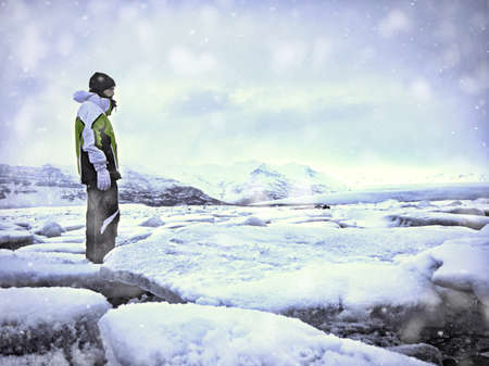 Traveler standing near frozen lake and mountains
