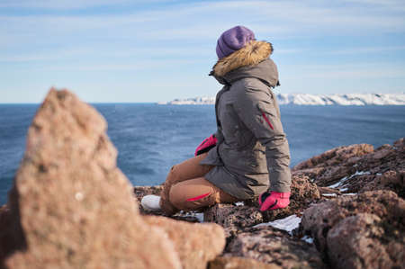 Traveler standing on icy shore near sea