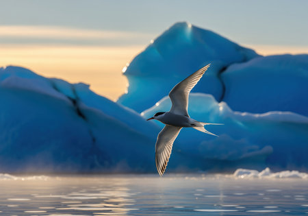 A beautiful arctic tern soars above the reflective glacial water, backlit by the setting sun against towering blue ice formations.
