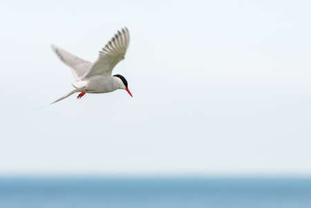 Arctic Tern (Sterna paradisaea) in flight with the sea horizon in the background. Farne Islands, May