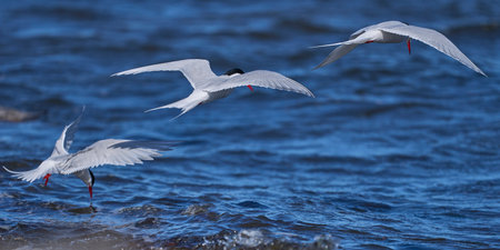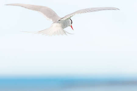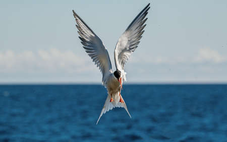 Turn with spread wings in flight. front view. Blue sky and sea waves in the background. Adult common tern in flight. Sterna hirundo. Natural habitat, summer season. Ladoga Lake